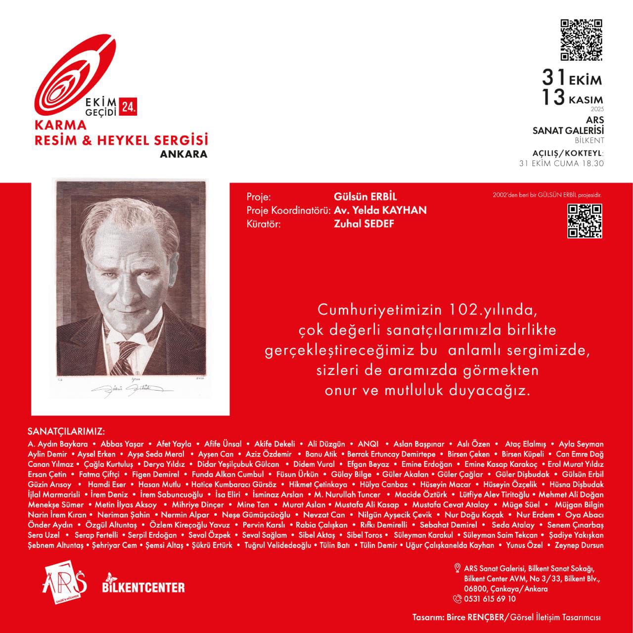 Ankara 24.Ekim Geçidi ise Proje Koordinatörü Av.Yelda Kayhan ve Küratör Zuhal Sedef tarafından gerçekleştirilmiş olup, tüm sanatseverlerimiz, 31.Ekim 2025-13.11.2025 tarihleri arasında, Bilkent Sanat Sokağı, ARS Galeri'de, muhteşem bir sanat şölenini izlemeye davetlidir.
